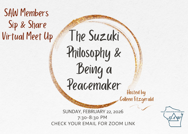 We, the Suzuki Association of Wisconsin, are teachers, parents, students, and friends dedicated to supporting each other and spreading the life-enhancing joy of Suzuki music-making. Living primarly in Wisconsin, we support and encourage each other in this joyous journey!